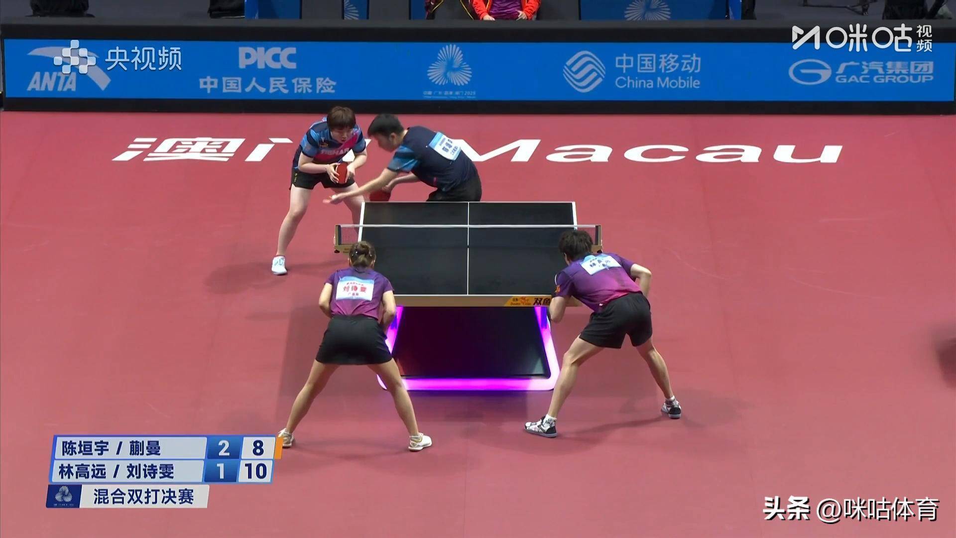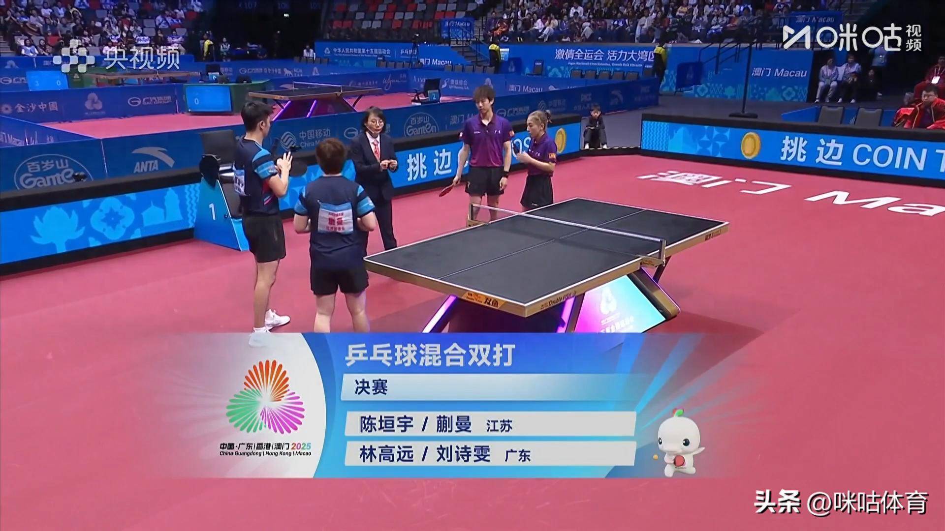 2025全运会乒乓球混双决赛,广东组合林高远/刘诗雯vs江苏组合陈垣宇/蒯曼。