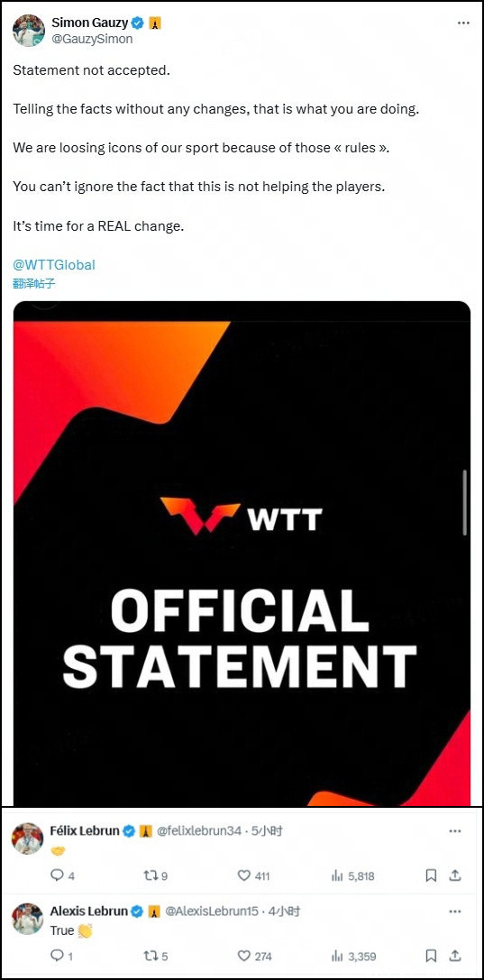 这些外协球员包括德国选手波尔、奥运单打铜牌得主奥恰洛夫、法国单打冠军西蒙·高茨、法国选手勒布伦兄弟以及韩国一姐田志希等等,其中波尔就宣称:“樊振东灭亡了平素糊口,在履历了这样多告捷之后,他理当作念回我方!”韩国一姐田志希则宣称:“或然候齐心合力是一件很难的事情,枪打出头鸟,但愿樊振东不会被这件事影响,好好打球,作念我方。”而话说得最狠的等于西蒙·高茨,在WTT作出声明诠释之后,他直言“不领受声明!因为你们这是不加任何更动地述说事实,因为这些国法,咱们正在失去这项相似的偶像东说念主物,你不可漠视樊振东退出寰宇排行对球员莫得匡助的事实,当今等于确实更动的时候了!”随后法国勒布伦兄弟立即在辩驳区回复说念:正确!