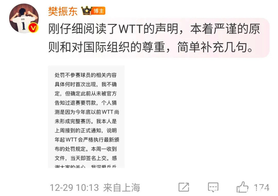 可是让东说念主出东说念观点象的是,WTT发布声明之后,樊振东遴荐了第二次硬刚!他在WTT声明下的辩驳区留言写说念:刚仔细阅读了WTT的声明,本着严谨的原则和对国外组织的尊重,神圣补充几句,WTT提到的“处罚不参赛球员”的有关实际具体何时初度出现,我省略情,但我详情的是,此前从未被官方示知过退赛要罚金,是以我个东说念主揣度是因为本年底畴昔WTT尚未变成齐备赛历,而我本东说念主是上周接到的肃肃陈说,陈说上明确提到了来岁开动WTT会严格奉行最新颁布的处罚规则,是以我本周一接到文献后,本日就签名(退出寰宇排行)上交了,感谢大家关爱,我喜爱乒乓球,也至心祝颂WTT越来越好!