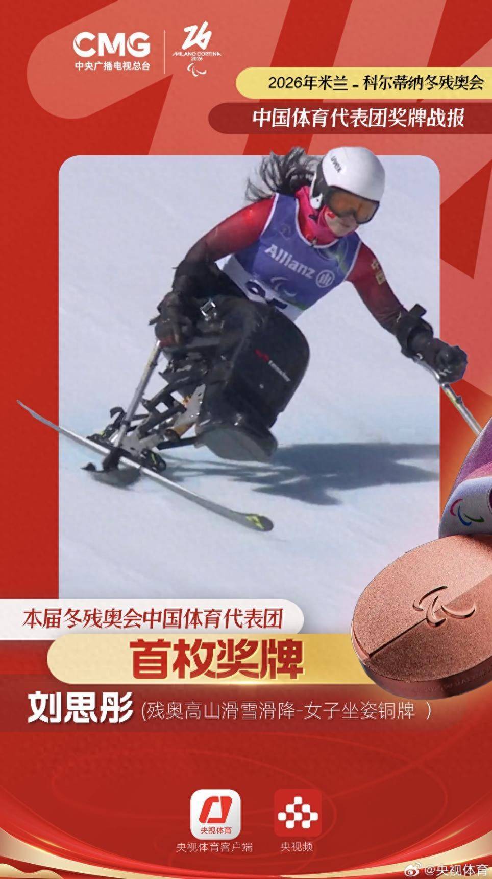 米兰-科尔蒂纳冬残奥会峻岭滑雪女子滑降(站姿)比赛体育录像/图片,中国代表团开幕式旗头刘想彤夺得铜牌!这是本届赛事中国代表团首枚奖牌!