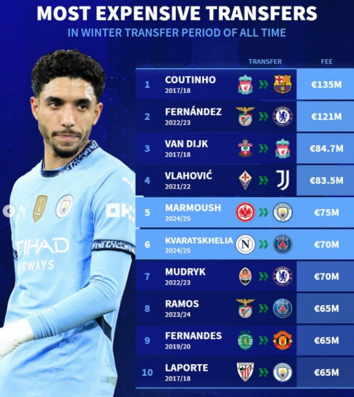 直播吧1月28日讯本年冬窗也曾周边尾声,《转会市集》也转头了历史冬窗引援最贵榜,库蒂尼奥1.35亿欧仍最高。