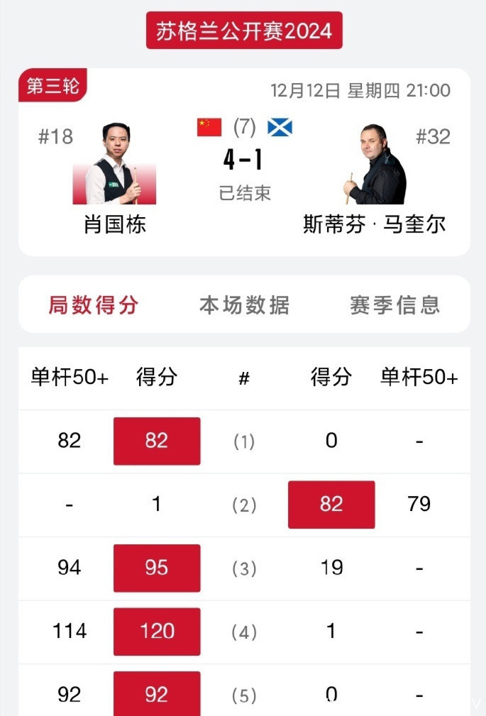 第四局,徐念念提高单杆质料,他打出单杆61分,到肖国栋通过零敲碎打,62-61一分险胜,3-1扩大越过上风,爱你取得两个赛点。第五局,莫得退路的徐念念反击无力,肖国栋则是通过几次上手,75-0锁定胜局,总比分4-1强势晋级。